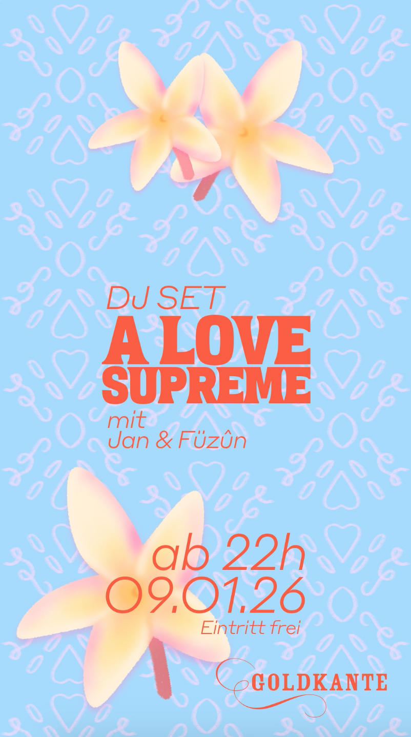 A LOVE SUPREME ist zurück in der Goldkante! Dieses Mal besucht uns Füzûn aus Krefeld, und zusammen mit Jan legt sie eine feine Mischung aus Disco-, Boogie- und Houseplatten auf.